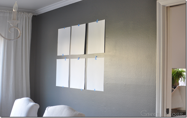 I decided I didn’t like the two rows of three after all. When you’re standing in the room it lacks enough weight on the wall. So two more poster board pieces, scissors, and cut-cut… and I’m sooooo much happier.